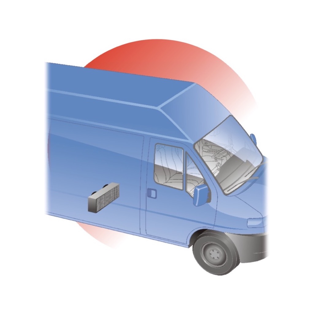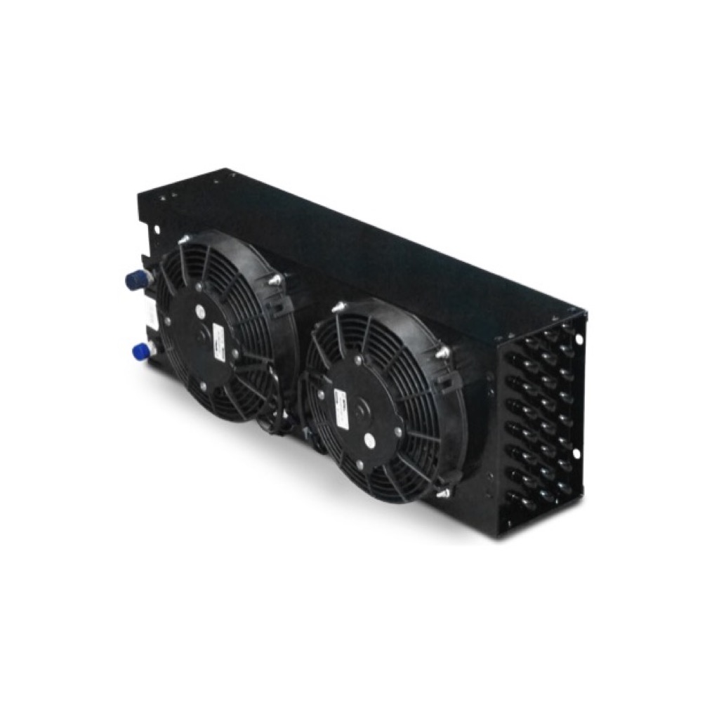 Condensatore elettroventilato principalmente installato sottopavimento, ma adatto anche ad altre collocazioni nel veicolo.