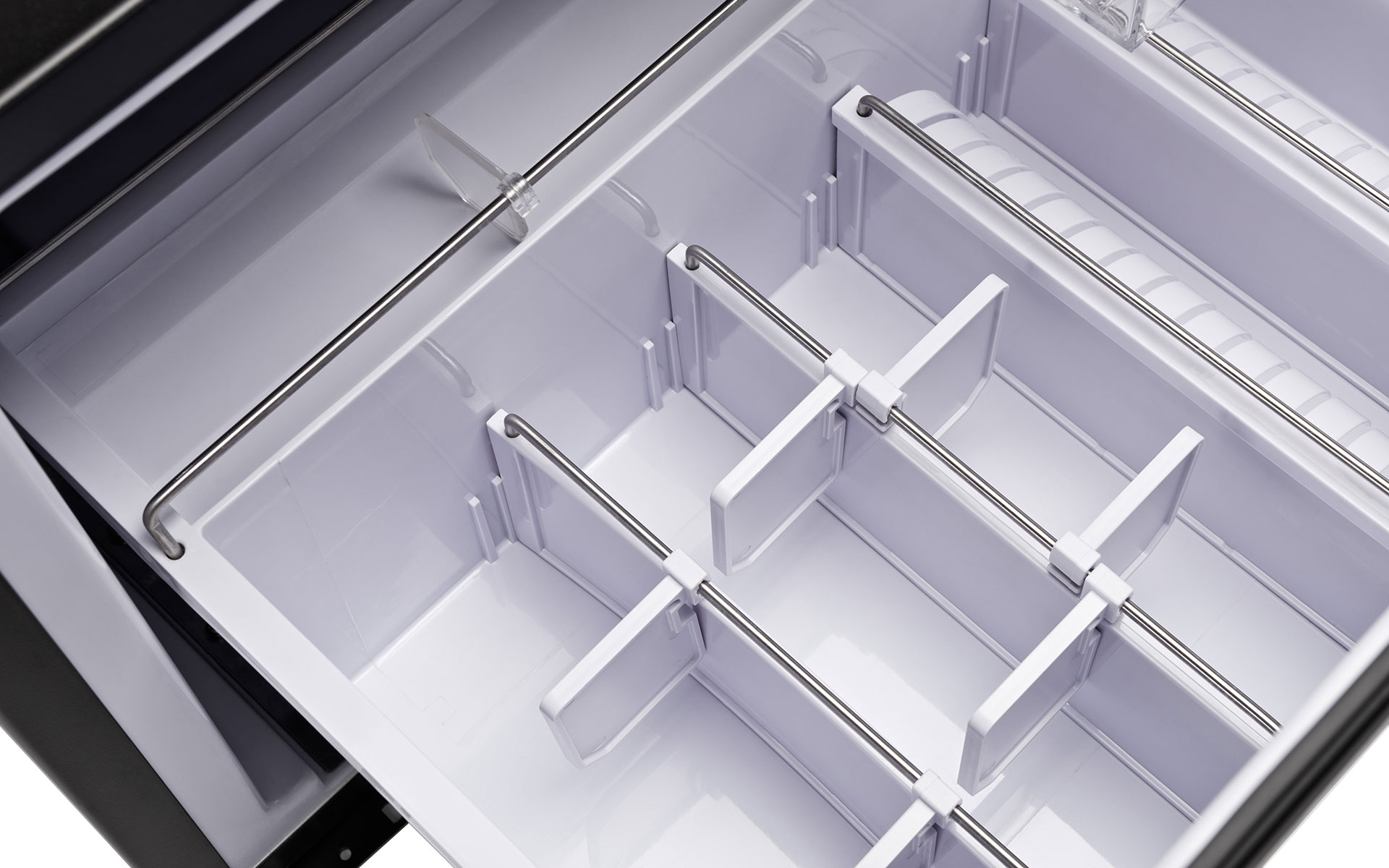 Silent and smart, the KD50 ECOSMART is fitted with a drawer system for easier access to products and their organisation. With a 50 litres capacity, an innovative design and customizable door panelling, the minibar can be used to create a vast selection of versatile aesthetic solutions that adapt to all project design requirements. The Ecosmart system allows you to reduce energy consumption and maximize the comfort of the guest in the room.